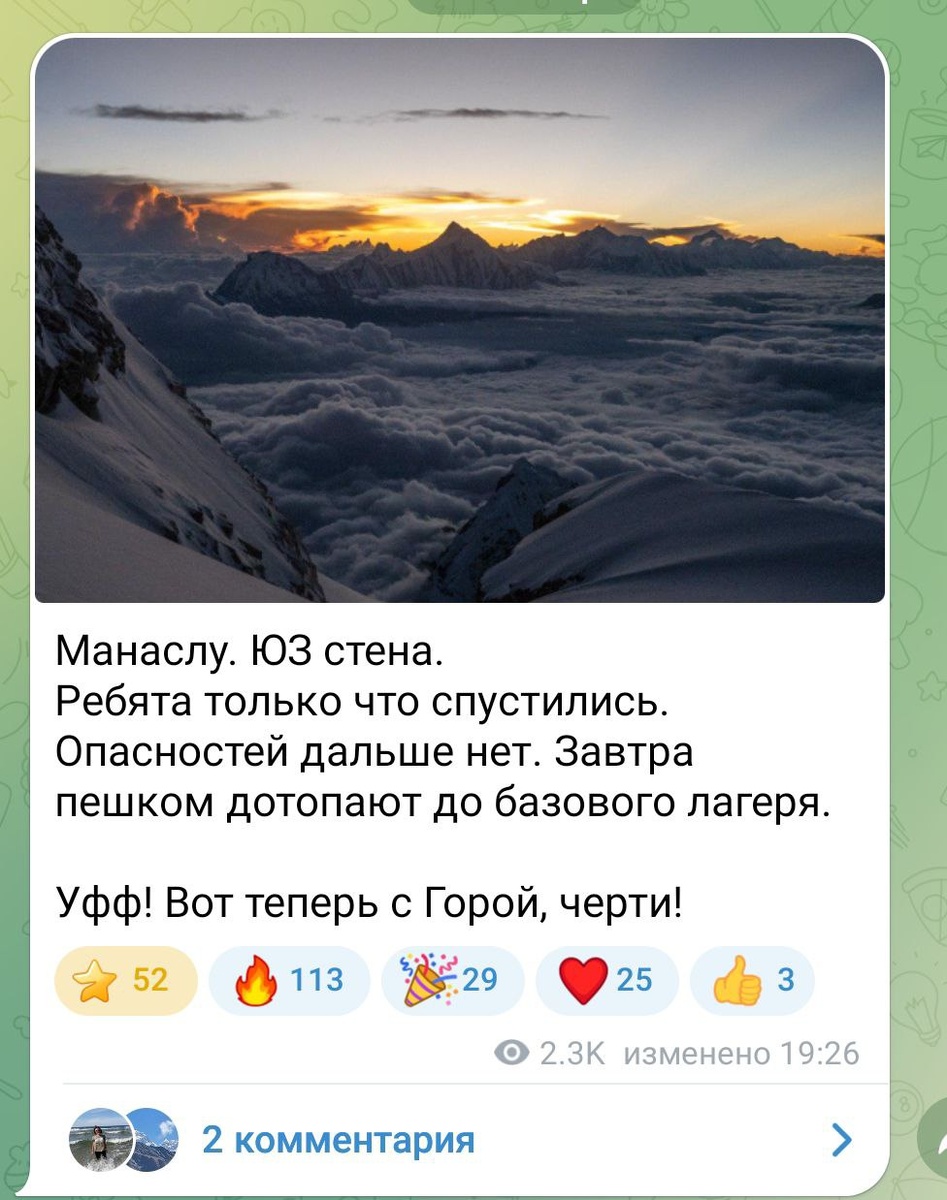 В ответ на пост 🙏 Хорошие новости о российских альпинистах, ранее застрявших в горах Непала: группа успешно спустилась с горы Манаслу Об этом сообщила в своём телеграм-канале главный редактор издания Mountain Анна Пиунова, которая поддерживает связь с группой. Сегодня альпинисты должны достигнуть базового лагеря на подходах к горе. При этом, как отметил руководитель группы Андрей Васильев, спуститься удалось «чётенько», так как пришла непогода. 📌 Подписаться на Москва FM / Наш чат-бот / Мы в MAX