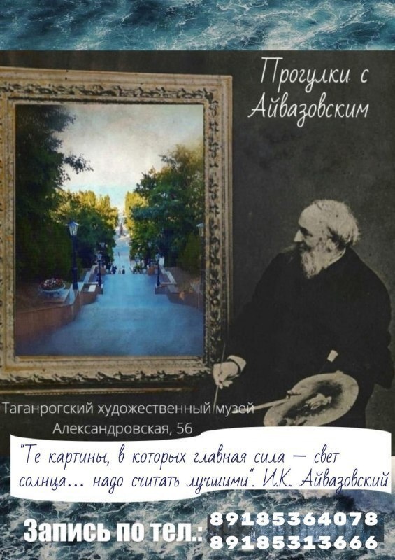 Бывал ли всемирно известный художник-маринист Иван Константинович Айвазовский в Таганроге? Был ли связан с его жителями? Писал ли Азовское море на своих полотнах? Ответы на эти и другие вопросы, касающиеся пребывания в Таганроге знаменитого художника, вы узнаете на пешеходной экскурсии «Прогулка с Айвазовским», которая состоится 28 октября. Начало в 12.00. Сбор группы у входа в здание музея по адресу: ул. Александровская, 56.