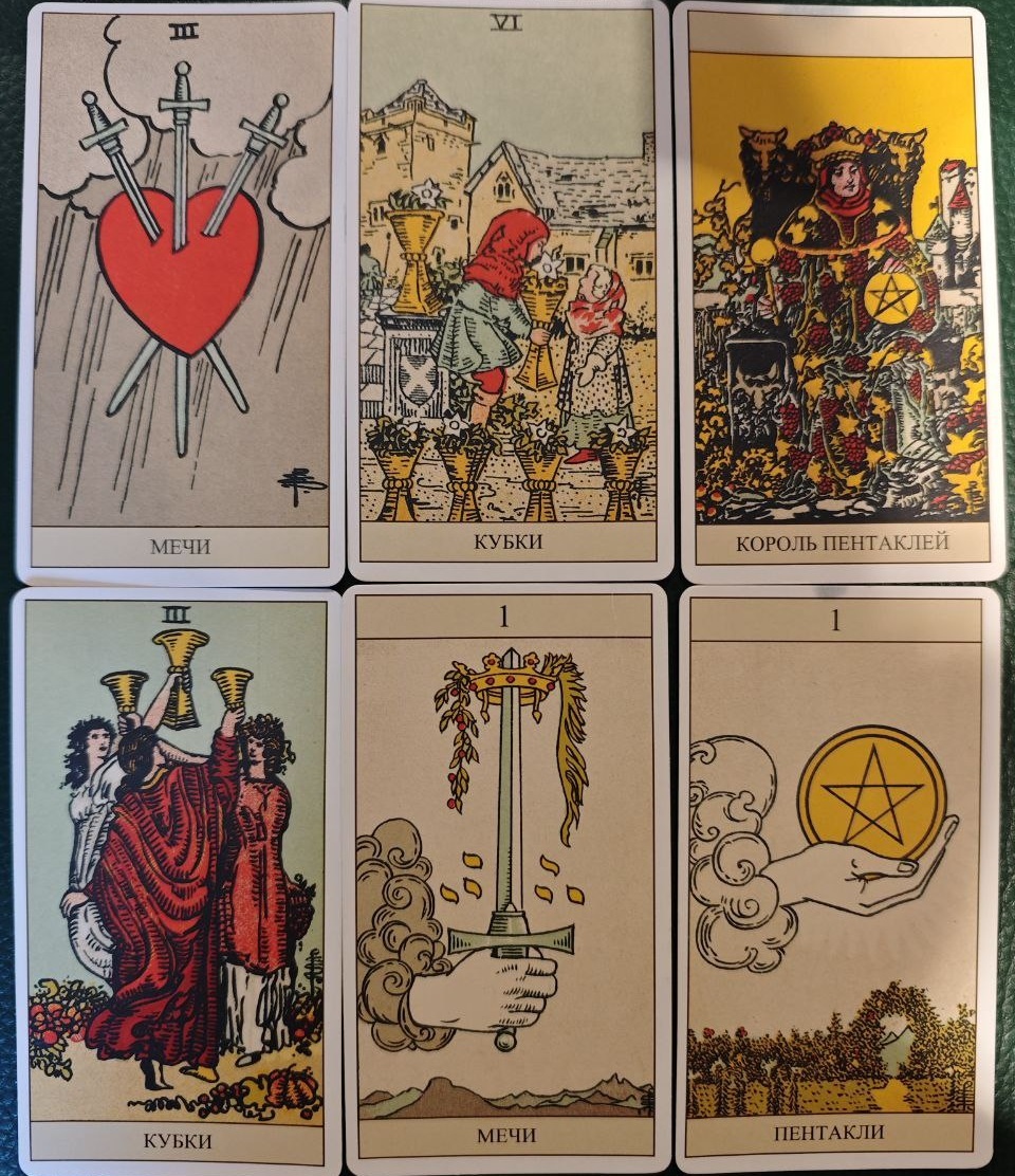 Карты: 3 Мечей, 6 Кубков, Король Пентаклей, 3 Кубков, Туз Мечей, Туз Пентаклей.