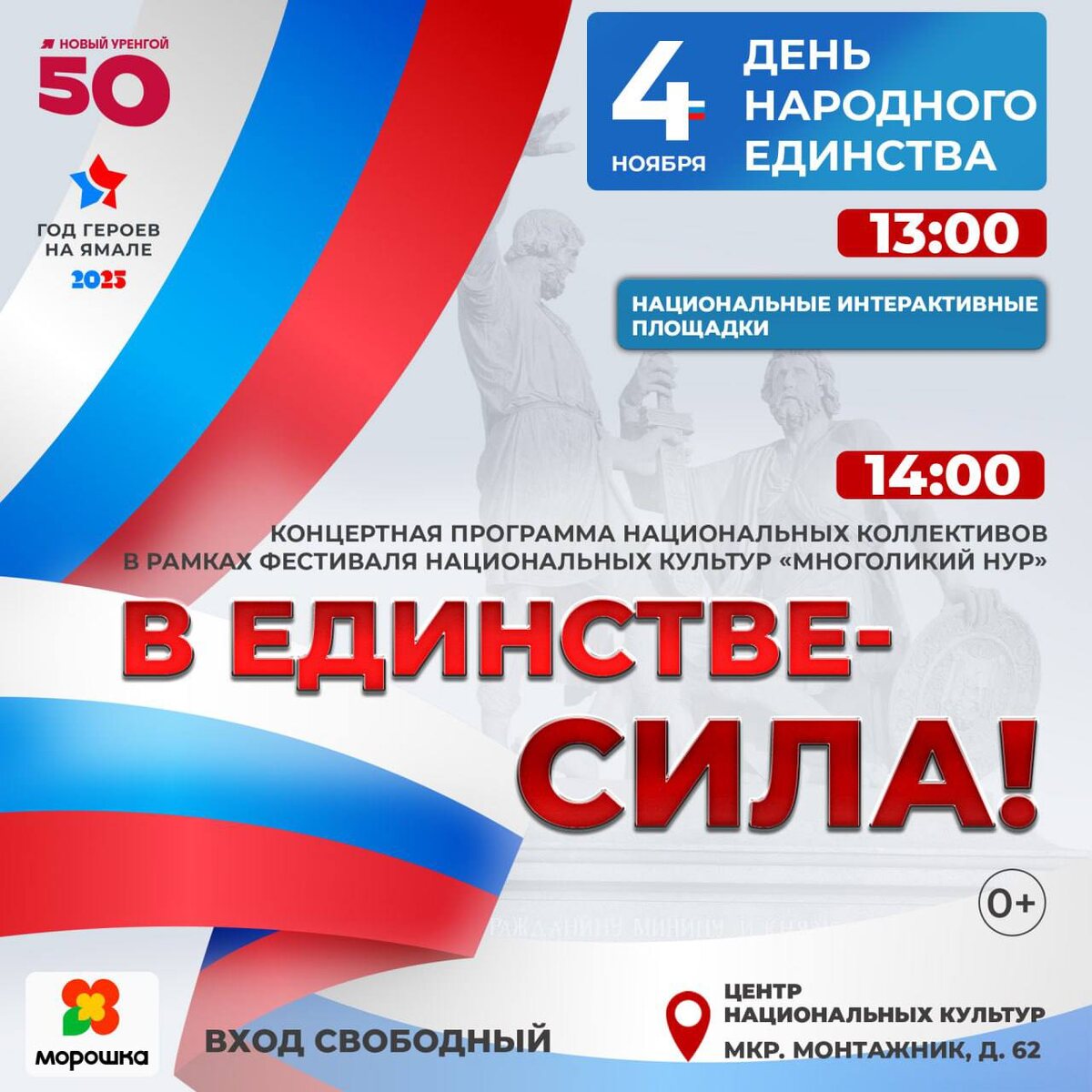Уже наследующей неделе вся страна будет праздновать День народного единства. 4 ноября в Центре национальных культур запланирована концертная программа и национальные интерактивные площадки. Зовите друзей и близких, вход будет свободный! #ГодГероев89