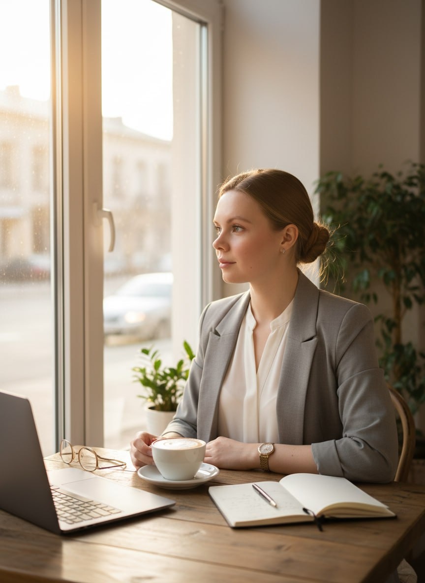 🎯 5 идей фотосессий 1. «Рабочее вдохновение» 📍 Локация: Светлое кафе с большими окнами, деревянными столами и зелёными растениями. На столе лежат ноутбук, чашка кофе с густой пенкой, открытый блокнот с записями и очки в тонкой оправе. Мягкий утренний свет создаёт уютное свечение вокруг. 👩 Образ модели: Женщина 25 лет в белой блузе из лёгкой ткани и сером жакете прямого кроя. Волосы собраны в низкий пучок, макияж естественный, с лёгким румянцем и блеском на губах. На запястье — тонкие золотые часы. 🎨 Стиль фотосессии: Тёплый лайфстайл с акцентом на детали и атмосферу уюта. Кадры — через окно, отражения в чашке, мягкие боковые ракурсы. Настроение — спокойная концентрация, вдохновение и лёгкость. 📚 2. «Сила знаний» 📍 Локация: Библиотека с высокими деревянными полками, приглушённым светом и мягким зелёным свечением лампы. На столе — раскрытая книга, чернильная ручка, чашка чая и плотные заметки. В воздухе — запах бумаги и тишина. 👨 Образ модели: Мужчина 30 лет в тёмно-синей водола