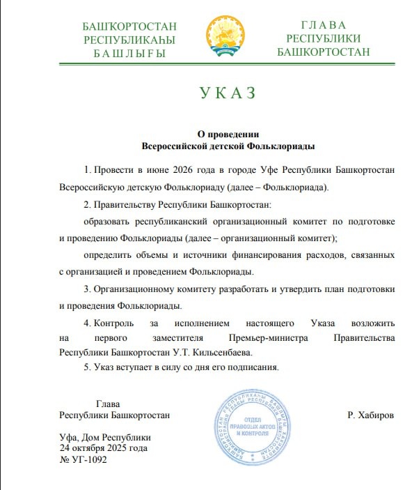 Летом 2026 года в Уфе пройдет Всероссийская детская Фольклориада - Указ Хабирова