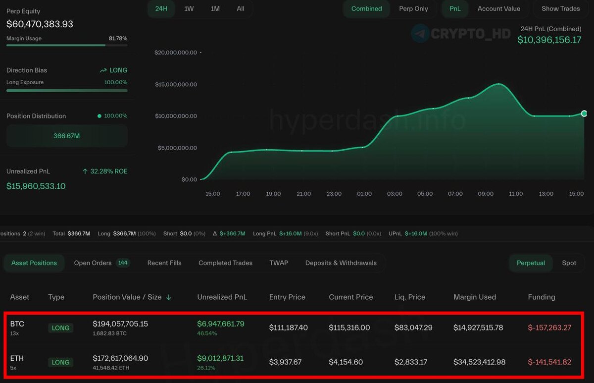 🔪 Трейдер «0xc2a3» продолжает наращивать свои лонги по BTC и ETH. Текущие LONG-позиции: ➠ По #BTC с 13х плечом уже на $194,000,000+. Точка входа: $111,187. Ликвидация: $83,047. ➠ По #ETH с 5х плечом уже на $172,000,000+. Точка входа: $3937. Ликвидация: $2833. Напомним, кит пока ни разу не ошибался. 100% профитных сделок. Нереализованная прибыль по текущим сделкам составляет почти $16,000,000. Кошелек: Hyperliquid Crypto Headlines