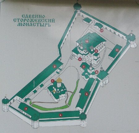 1. Собор Рождества Прсв Бгрдицы (1404–1405) https://savvastor.ru/?page_id=2221 2. Дворец царя Алексея Михайловича, 1650-е годы, 1687 г. 3. Малый келейный корпус, XVII в., XIX в. 4. Большой братский корпус XVII–XIX вв. 5. Царицыны палаты, 1650-е гг. 6. Троицкая церковь, 1652 г. 7. Трапезная церковь иконы Казанской Божьей Матери, 1807 г. 8. Колокольня-звонница, 1650-е гг. 9. Церковь преображения Господня, 1650-е гг. – 1693 г. 10. Трапезная, 1652–1654 гг., XIX в. 11. Казначейский корпус, XVII–XIX вв. 12. Стрелецкие палаты, XVII–XVIII вв. https://zundercom.narod.ru/trips/velo/2306zvenigorod.html Выход царицы Марии Ильинишны Милославской с Красного крыльца Царицыных палат Саввино-Сторожевского монастыря