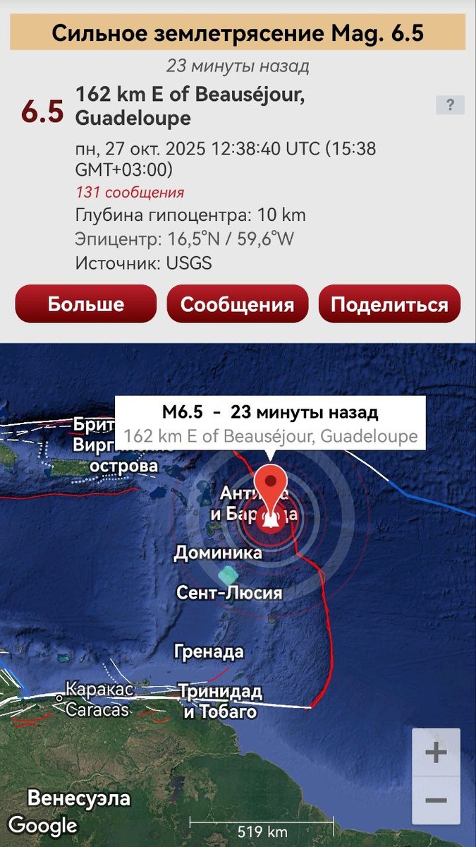 В ответ на пост Ураган Мелисса (фото 2) не смог полностью устранить неравновесие на Карибской плите, поэтому Земля её решила еще и тряхнуть. Крайние ОСТИ по восточной границе плиты наблюдались 20-22 октября (фото 3-5). Напряги вдоль Венесуэлы от 16 октября в итоге ушли на северо-восток. ===== Hurricane Melissa (photo 2) could not completely eliminate the imbalance on the Caribbean plate, so the Earth decided to shake it anyway. Last CSTI along the eastern boundary of the plate were observed on October 20-22 (photos 3-5). Tectonic stress along Venezuela from October 16 eventually moved to the northeast.
