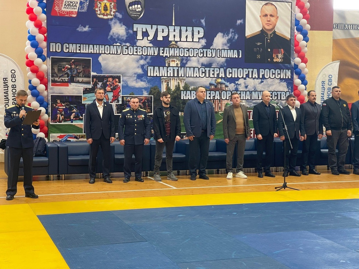 Первый заместитель Председателя Правительства региона Денис Боков вручил медаль «За отвагу» ветерану СВО, участнику областного проекта «ГЕРОИ62» Петру Рябову. Торжественная церемония награждения прошла в рамках открытия турнира по смешанному боевому единоборству (ММА), посвященному памяти уроженца г. Рязани, Мастера спорта России, кавалера ордена Мужества А.А. Тарасюка, погибшего при исполнении боевых задач в Сирийской Арабской Республике. Соревнования состоялись в Академии единоборств г. Рязани. Приветствуя от имени Губернатора Павла Малкова его участников, первый заместитель Председателя областного Правительства Денис Боков подчеркнул: «Это не просто турнир. Это дань памяти Александру Александровичу Тарасюку, который погиб, отстаивая честь и независимость нашей страны. Сегодня мы вспоминаем всех защитников Отечества, сложивших свои головы на полях сражений, а также благодарим тех, кто сейчас защищает интересы России в зоне СВО». В рамках церемонии Денис Боков вручил медаль «За отвагу