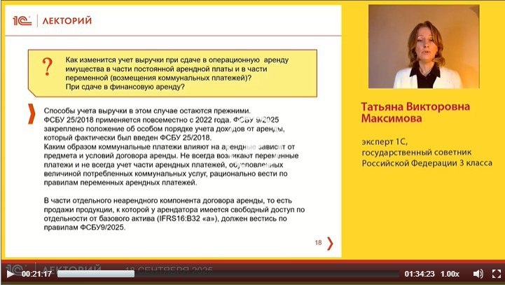 ❓Как изменится учет выручки при сдаче в операционную аренду имущества в части постоянной арендной платы и в части переменной (возмещения коммунальных платежей)? При сдаче в финансовую аренду? На этот и другие вопросы ответила Татьяна Максимова, государственный советник 3 класса РФ, эксперт фирмы 1С в лекции на тему: Обзор ФСБУ 9/2025 «Доходы» и подготовка к применению стандарта Отзыв слушателя: Было очень полезно ознакомиться с новым стандартом и прикоснуться к изменениям 👉 Смотрите бесплатно полную видеозапись лекции 🚨Подписывайтесь на @lector_1c