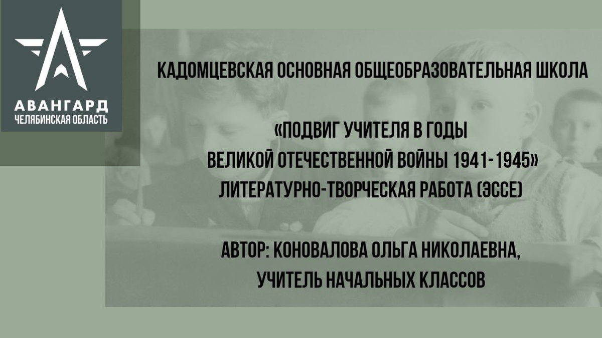 В областной акции "«Подвиг учителя в годы Великой Отечественной войны 1941-1945» Литературно-творческая работа (эссе) принимают участие не только учащиеся и студенты нашей области, но и педагоги. Представляем Вам работу учителя начальных классов Кадомцевской основной общеобразовательной школы Троицкого муниципального района Ольги Николаевны Коноваловой.