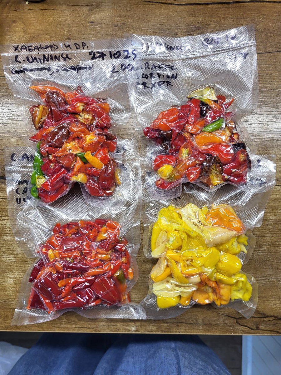 🍂🍁 На огороде — осень. Кусты сбрасывают листву, перцы медлено дозревают. Собрал ассорти разных сортов, остатки урожая. Заготовил малыми партиями по признакам цвета и степени остроты. Как вы думаете, почему эти перцы в вакуумных пакетах 😏 ?