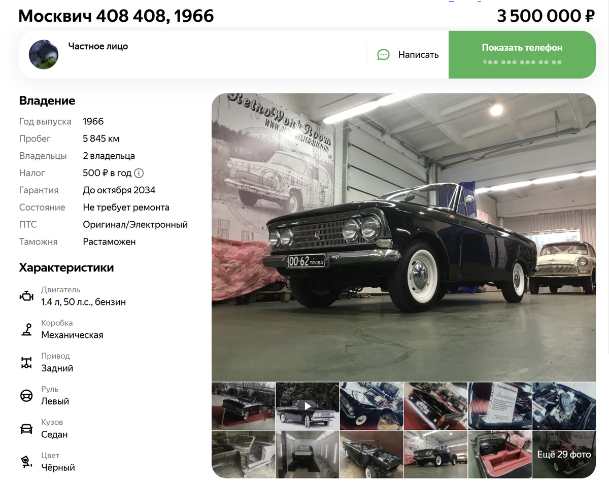 Уникальности данному автомобилю добавляет тот факт, что за все время существования завода АЗЛК с его конвейера сошло всего два прототипа этой модели, однако представленный образец является осовремененной копией легендарной машины. Оригинальный «Турист» был кабриолетом со съемным жестким верхом. В новодельной версии крыши нет, но, как уверяет продавец из Подмосковья, ее можно доукомплектовать за дополнительную плату. «Четыреста восьмой» визуально идентичен оригиналу и окрашен в черную эмаль, а салон перешит в алую кожу. Силовой агрегат остался прежним — под капотом скрывается 1,4-литровый 50-сильный карбюраторный мотор, однако владелец готов заменить его на двигатель от Mercedes. Трансмиссия — четырехступенчатая с приводом на заднюю ось. Тормозная система и ходовая часть были установлены от более свежей модели — «Москвич-2140». Хозяин запрашивает за свой уникальный «Москвич» 3,5 миллиона рублей. Учитывая небольшой пробег в 5 900 километров и проведенные восстановительные работы, машина