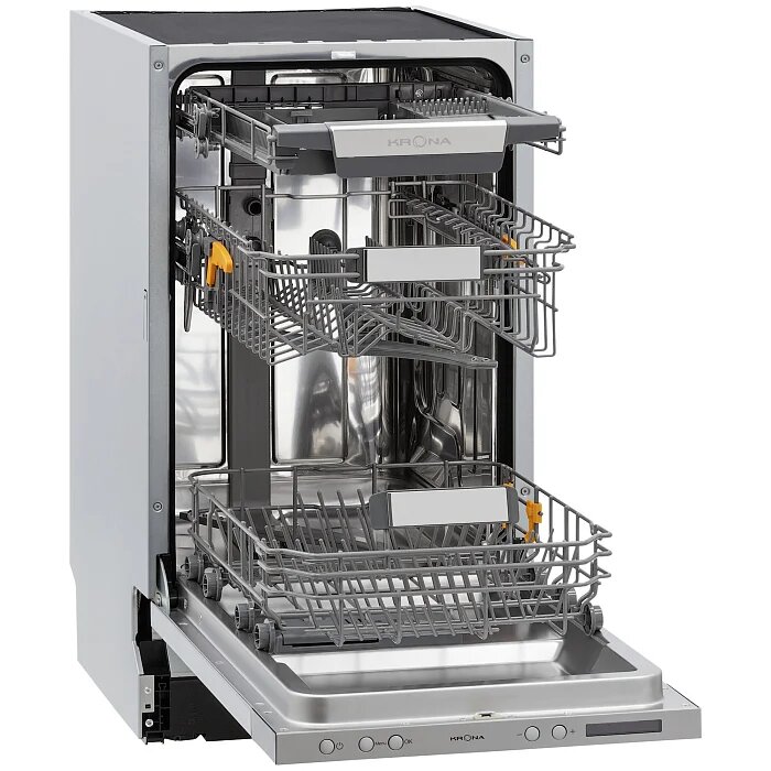 KRONA KAMAYA 45 BI — это встраиваемая посудомоечная машина шириной 45 см, рассчитанная на 10 комплектов посуды. Она имеет несколько режимов мойки, включая интенсивный, экономичный и деликатный. Важной особенностью является наличие защиты от протечек AquaStop.