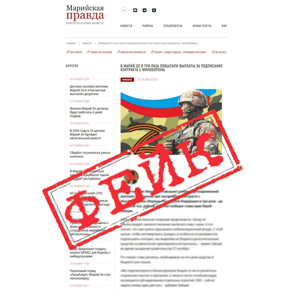 В социальных сетях распространяется фейковый скрин страницы «Марийской правды» с информацией о повышении выплат военнослужащим контактной
