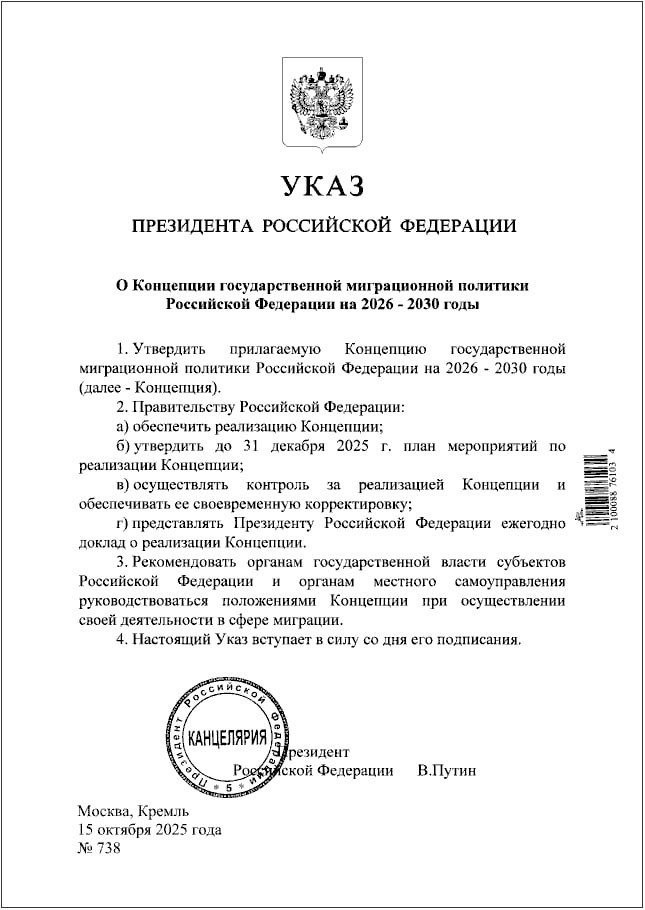 ⚡️Владимир Путин утвердил концепцию государственной миграционной политики России на 2026-2030 годы