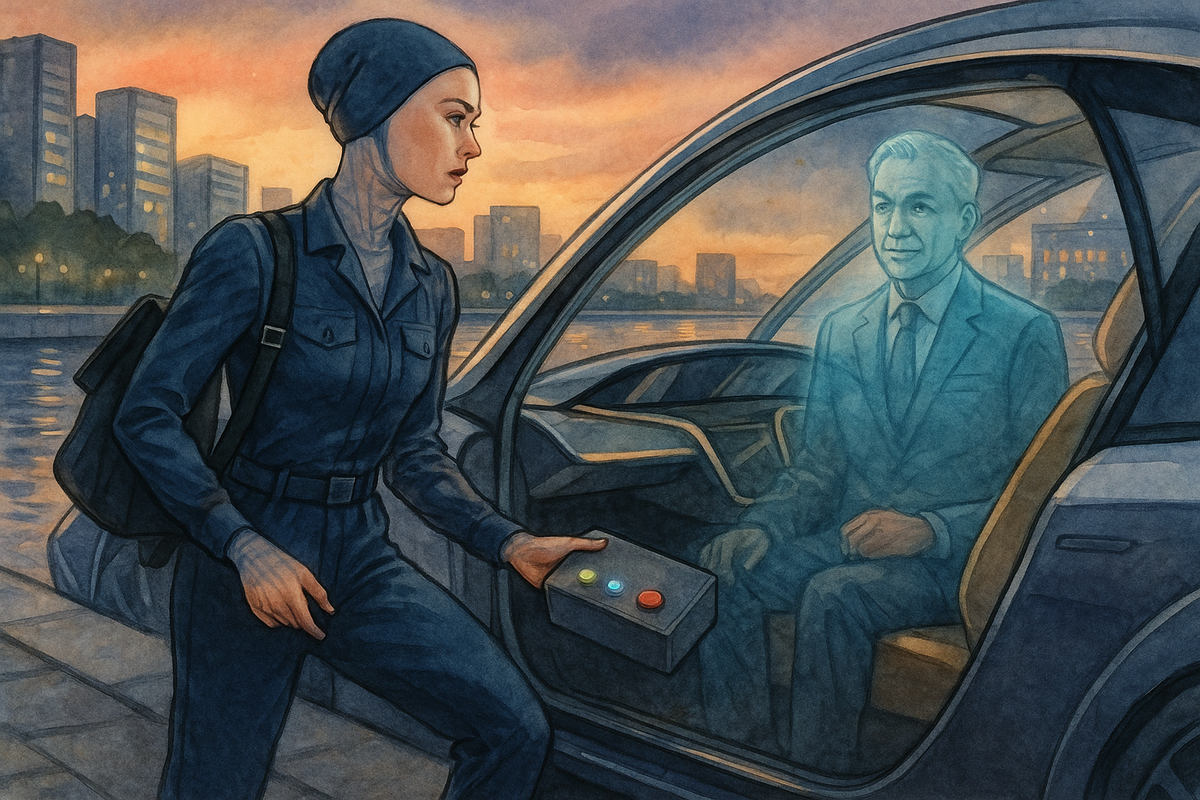 Эта красавица и модница явно спешила на какое-то важное мероприятие. Ей хватило семи минут, чтобы добежать до набережной, где было припарковано ожидавшее её роскошное транспортное средство. Женщина расположилась на заднем сиденье. Унимобиль-беспилотник быстро спустился на воду. Пассажирка устроилась на своём месте так, чтобы ей было легко повернуться лицом к невидимому собеседнику. Кроме неё, в машине пока никого не было. Она достала из сумки какую-то тёмно-серую коробку с матовой поверхностью, напоминавшую одновременно футляр для украшений, школьный пенал или шкатулку в духе минимализма. Предположительно, на верхней стороне коробки присутствовала сенсорная панель, где зелёным, желтым и синим цветами обозначались функции «включение», «перезагрузка» и «выключение». Здесь же находились две крупные выпуклые кнопки наподобие тех, что использовались на приборах в двадцатом веке. Их нажатие требовало значительных усилий. Белая кнопка означала «консервацию», красная – «уничтожение».