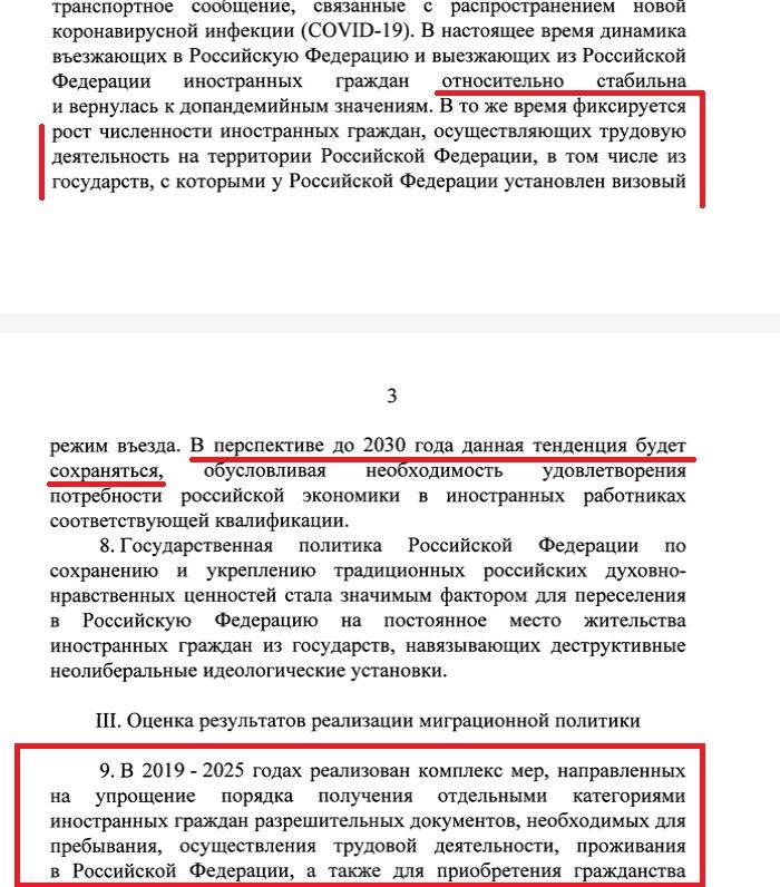 Выделил, как мне кажется, принципиальные положения Концепции государственной миграционной политики на 2026-2030 годы. Если читать буквально, то до 2030 года ничего в плане масштабов привлечения различных народов в Россию менять не планируется, общее число приезжих будет расти. Кроме того, в документе также предусмотрено положение, что если демографическая динамика резко не выправится, то внешняя переселенческая миграция будет продолжена, т.е. явно не ограничится 2030-м годом. Также в очередной раз отмечу, что массовая нересурсная миграция экономику не развивает - она её прогибает, и данный документ базируется на ложной посылке. Единственное принципиальное изменение по сравнению с документами прошлых лет - это намерение побороться за качество мигрантов, т.е. завозить не только лишь всех. Будем посмотреть. ЛИ́НДРЕ 🫧