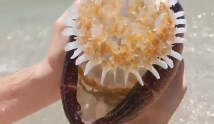 На берегу океана турист обнаружил странное существо, которое явно не известно науке. Это нечто что-то среднее между медузой и крабом.