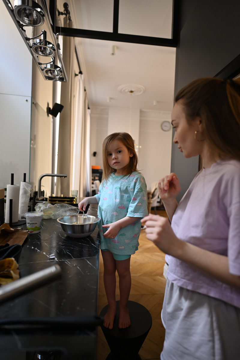Без сценария, без команды — просто квартира, три образа, дочка и… собака.Ну что может пойти не так? (📸 Визуал: общий кадр квартиры / утро, свет, все улыбаются) Мы проснулись, начали готовить сырники, заварили чай.