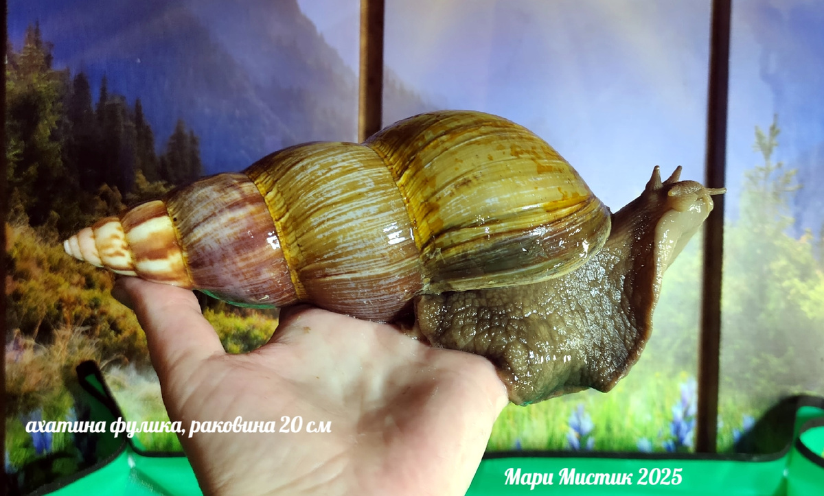 Читала о крупных по размеру раковины архахатинах маргината маргината , архахатинах овумах, но фото этих видов улиток с размером раковины 20 см и больше - не видела.