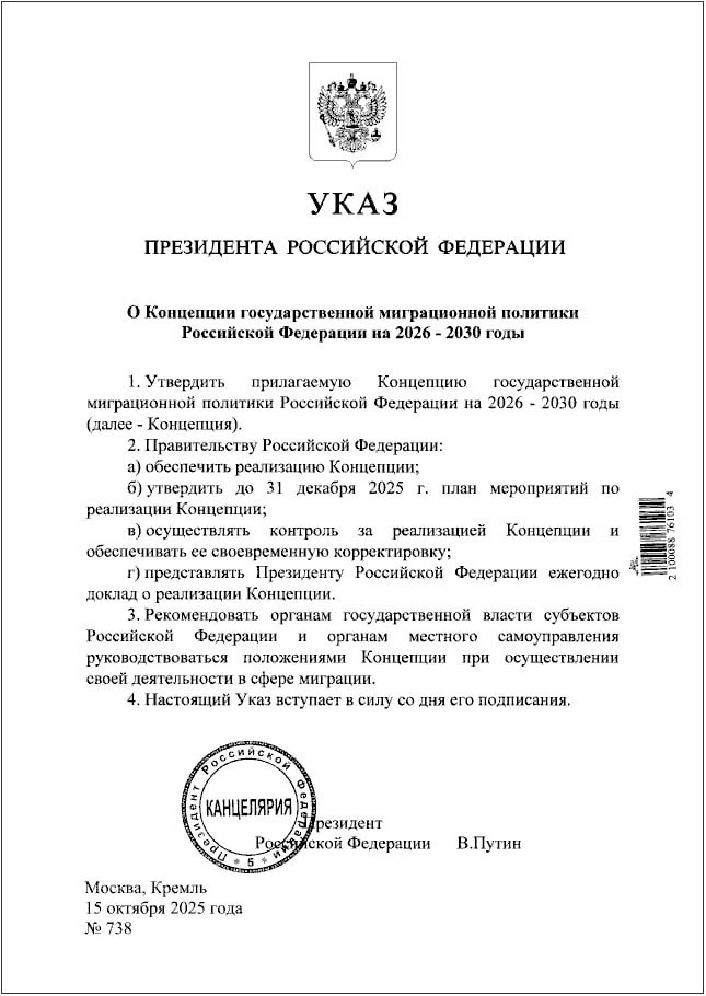 ⏺Путин утвердил концепцию государственной миграционной политики России на 2026-2030 годы