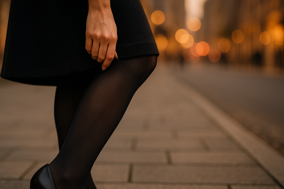 Колготки — как фильтр в телефоне: меняют всё. Одни «дорожают» платье, другие превращают его в форму для школьного концерта. Разбираем плотности и финиши, чтобы не промахнуться. Запомнить просто: чем плотнее и матовее — тем “дороже” выглядит тёмное платье (до разумного предела). Матовая поверхность «съедает» блики и выравнивает ногу, создаёт одну вертикаль с платьем и обувью. Глянец же подчёркивает коленку, даёт «переломы» и часто уходит в «дешёвый блеск». Берём: matte / semi-matte. Осторожно: shiny / glossy — только для сцены и при идеальной обуви. Для тёмного платья в 9 случаях из 10 «дороже» выглядят матовые 30–40 den в монохроме с обувью. Зимой — 50–80 den. Глянец — по случаю и точечно. Остальное — чистота, уход и дисциплина «без стрел».