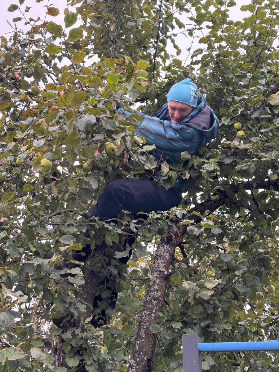 Даже после долгого пути, почти без сил, не можем оставить вас без утренней истории. К утреннему кофе... До отъезда в небольшой подмосковный трип мы с Дианой славно потрудились на фазенде. Причём так интересно получилось: бабушка у нас поехать не смогла (перетрудилась "на тюльпанах" до этого). Мы думали, сейчас без неё все быстро сделаем. Поручения же раздавать некому... И настолько вошли в трудовой кураж, что уезжали затемно. В деревне тишина... В холода всё чаще наступают такие моменты, когда люди больше времени проводят дома. Гуси, куры тоже не гуляют. Листья почти опали и не шелестят на ветру. Птицы улетели. Тишина... Мы радио включать не стали, чтобы не выбиваться из общего тренда — не шуметь. Огородники убрали технику, и даже траву косить не надо, представляете? Всё это так непривычно. Так что за дела-то были? Увидели, что яблоки самого позднего нашего осеннего сорта стали опадать. Было дело, Синап северный собирали по снегу. Это очень плотный сорт. И, в отличие от Антоновки,