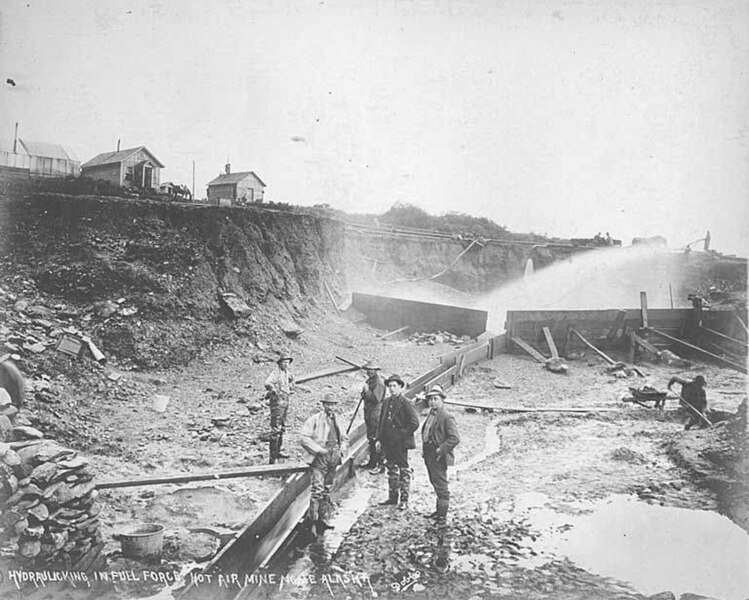 День добрый! В прошлый раз Мы с Вами познакомились с тем, как гидромониторы работали в самых дальних Советских золотых приисках до 1970-х годов. Ссылка на прошлый материал ждет Вас в конце статьи. США за свою историю пережили целый ряд золотых лихорадок, но самыми крупными были Калифорния и Аляска. В них, как и в остальных приисках, гидромониторы использовались массово и были основным способом добычи золота до начала 20 века. В разное время, в разных штатах и районах против старателей восставали все остальные, кому не нравилось, что вся грязь сливалась в ближайшие реки. Это приводило к постоянным запретам властей на использование гидромониторов и часто сводило их использование к нулю. Позже стали применяться уже более эффективные методы добычи. Так что все фотографии, которые Я для Вас приготовил, будут выполнены в период от 19 века, до начала 20-го. Гидромонитор работает на заднем фоне, на переднем-отводной лоток. Между 1901 и 1911 годом. Прииск компании "Hot Air Mining Company" около