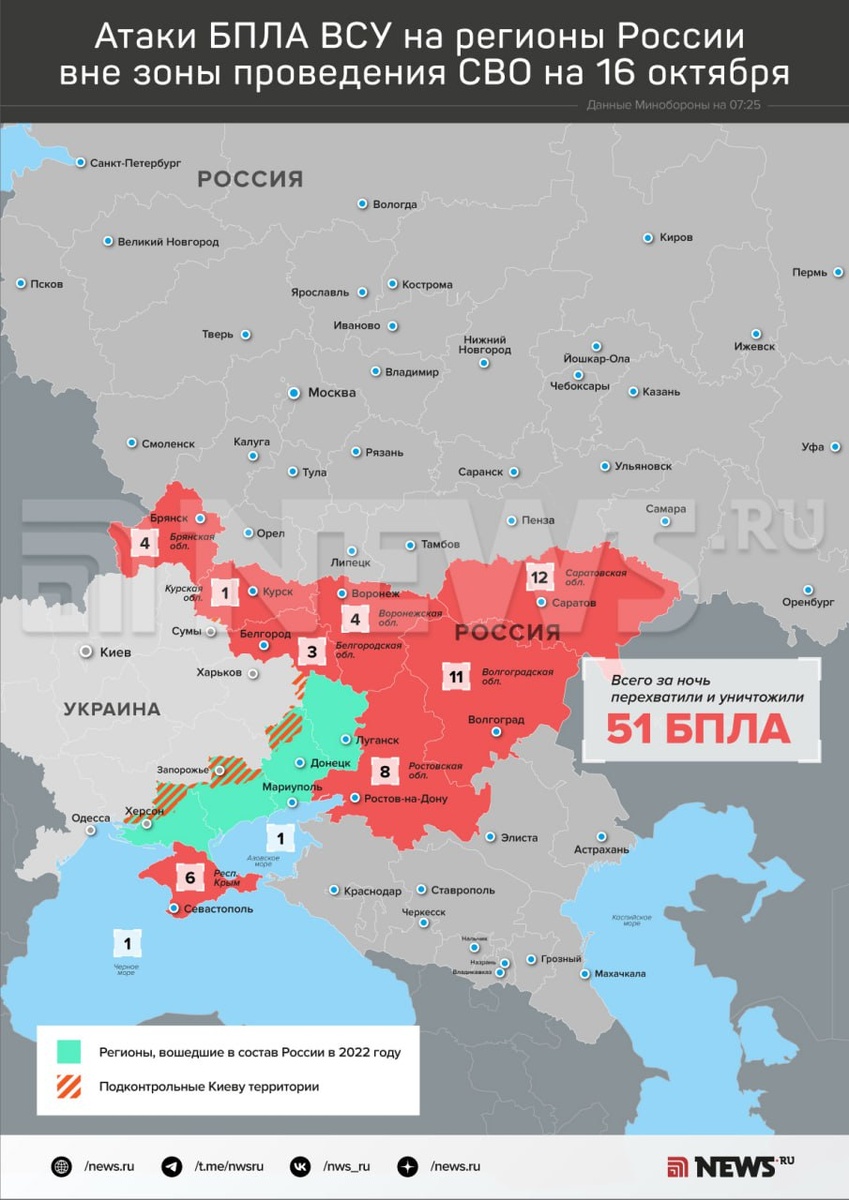 Силы ПВО за ночь сбили 51 беспилотник над регионами России, сообщили в Минобороны. 12 дронов уничтожили над Саратовской областью, 11 — над Волгоградской, восемь — над Ростовской, шесть — над Крымом, по четыре — над Брянской и Воронежской областями, три — над Белгородской, по одному — над Курской областью и над Черным и Азовским морями. ⭕️ Подписаться | Мы в MAX | Буст