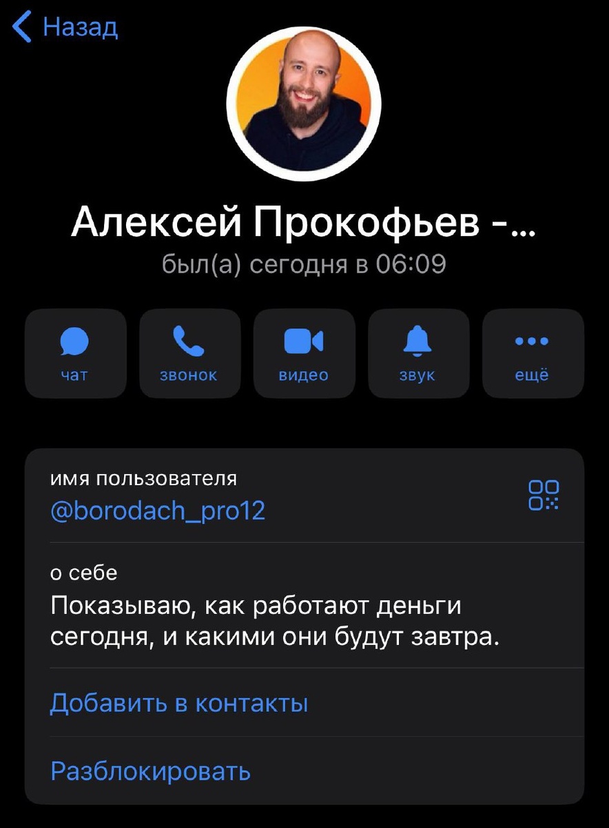 ⚠️ Финансисты! Появился фейковый аккаунт, который пишет от моего имени (скрин выше). Если вам написал «Алексей Прокофьев», обязательно проверяйте имя пользователя: мой единственный аккаунт @borodach_profinancy. Все остальные - это мошенники. Никогда не отправляйте деньги и не переходите по ссылкам из таких сообщений. Будьте внимательны.