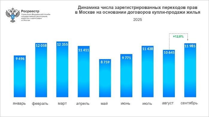 🪖 В Москве вырос спрос на готовое жильё — Росреестр В сентябре 2025 года число сделок с готовым жильём в столице выросло на 12,6% по сравнению с августом и на 5,2% — в годовом выражении. 🔵Всего за месяц зарегистрировано 11 985 договоров купли-продажи, тогда как в августе их было 10 645. 📌 С начала года москвичи оформили 97 918 сделок — это на 3,7% меньше, чем за тот же период 2024-го.