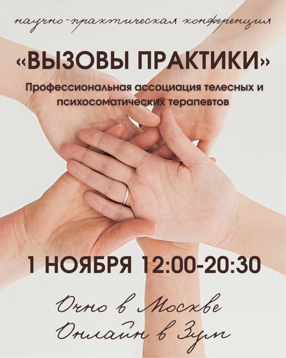 Дорогие, напоминаем вам, что уже через 2 недели — 1 ноября (сб) — состоится ежегодная научно-практическая конференция телесных и психосоматических терапевтов «Вызовы практики»