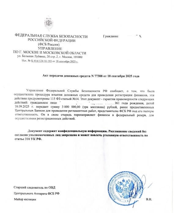Бухгалтер из Прокопьевска повелась на фальшивые документы от ФСБ и отдала мошенникам 5 млн рублей. Несколько недель назад 64-летней женщине, которая работает бухгалтером в местной организации, позвонила якобы коллега. Она сообщила о проверке на ее рабочем месте и предупредила, что с ней свяжутся сотрудники правоохранительных органов. Затем позвонил незнакомец, представившийся сотрудником ФСБ. Он запугал ее, что из-за утечки персональных данных злоумышленники попытались перевести за границу с ее счета за границу 700 000 рублей. Он убедил женщину, что для сохранения денег необходимо снять наличность и отдать на проверку. Для конспирации горожанка приобрела новый мобильный телефон, а после сеансов связи удаляла историю входящих звонков и сообщений в мессенджерах. Под диктовку мошенника жительница Прокопьевска сняла со счета 3 млн рублей и передала незнакомому мужчине, а тот в ответ вручил женщине документ под названием «акт передачи денежных средств» и поддельное постановление о приобщ