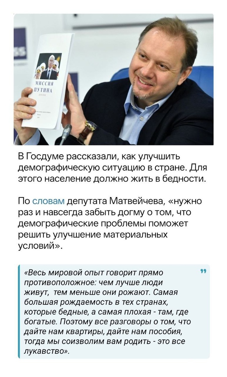 🤡 Депутат Госдумы Матвейчук раскрыл гениальный план: нищета — лучший стимул для рождаемости