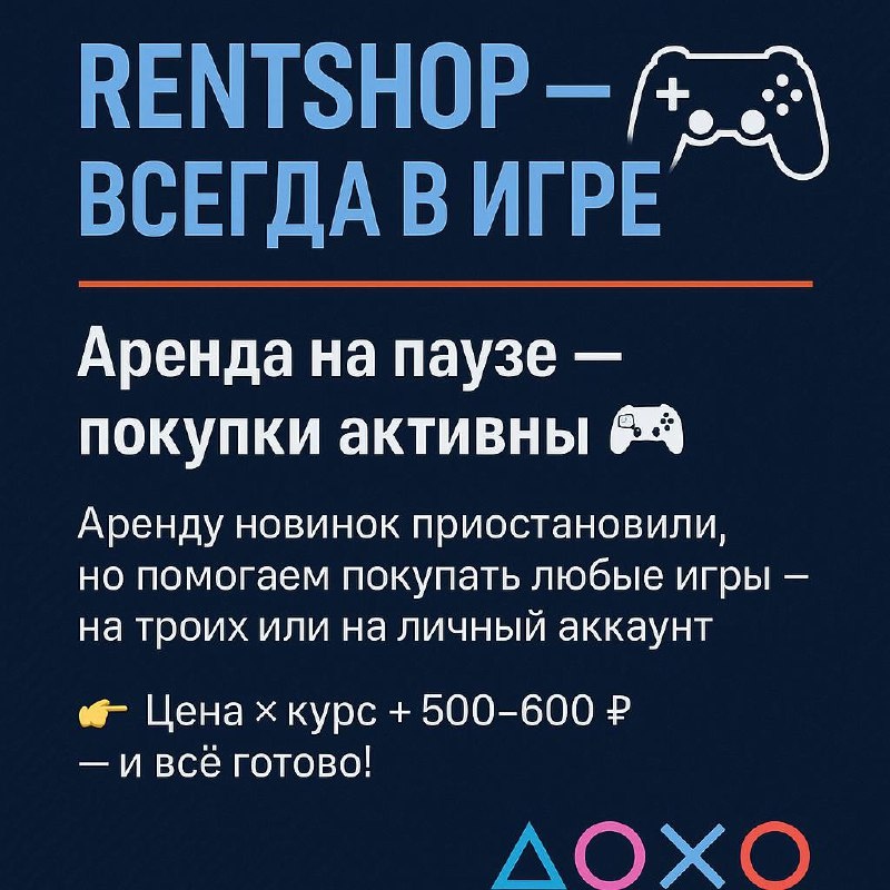 🔥 RENTSHOP сообщает! 🔥 🎮 Аренда новинок — на паузе, но мы по-прежнему в игре и готовы помочь всем, кто хочет купить игры на PS4 и PS5 💪 💡 Хотите игру на троих или на личный аккаунт? Мы сделаем всё под ключ — быстро, удобно и честно. 📋 Как это работает: 1️⃣ Смотрите цену игры. 2️⃣ Умножаете на текущий курс. 3️⃣ Добавляете +500–600 ₽ — и всё готово! 💾 Мы всё покупаем, настраиваем и передаём в идеале — вам остаётся только играть и кайфовать 🎯 💬 Пишите в RentShop, если нужна помощь или совет. Мы всегда на связи ⚡️ ❤️ Спасибо, что остаетесь с нами! Игры — это не просто хобби. Это стиль жизни.