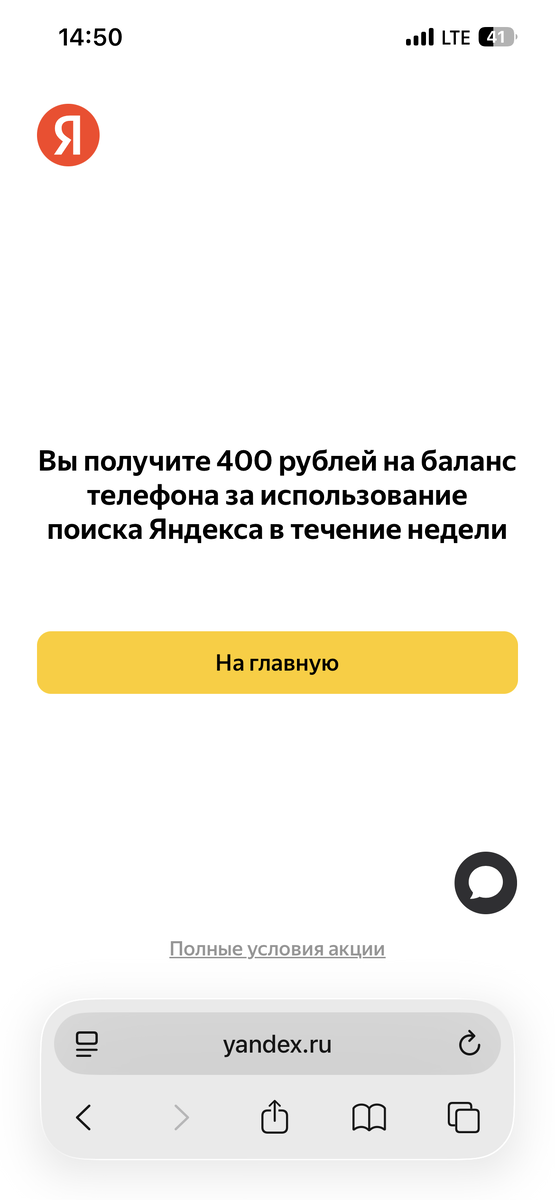 Всем привет,расскажу я вам историю, как меня яндекс обманывает так еще и рекламу в банках покупает, так сказать доверенное «лицо» и партнер все началось с того, что я наткнулся на рекламу в своем мобильном преложении банка, звучало оно так «сделай яндекс поисковой машиной, получи до 600р», как итог я выполнил все условия, и мне поступил ответ мне интересен критерий ,как они определяют, кому 600 кому 400, но вроде как всем должны отправить 400р, даже тут уже начинается обман. далее в течении недели я пользовался яндексом по полной,в итоге через 7 дней ничего не пришло, я обратился в банк, там мне сказали « Здравствуйте, Максим. Понимаю, что вы ожидаете начисление по акции, но, к сожалению, для этого вам необходимо обратиться непосредственно в сам сервис Яндекс.» тоесть выходит так, они рекламируют продукт, по факту просто обман для набора пользователей, и все скидывают на яндекс, получается они считают что не несут ответственности за то что рекламируют, но мы не об этом говорим. в данн