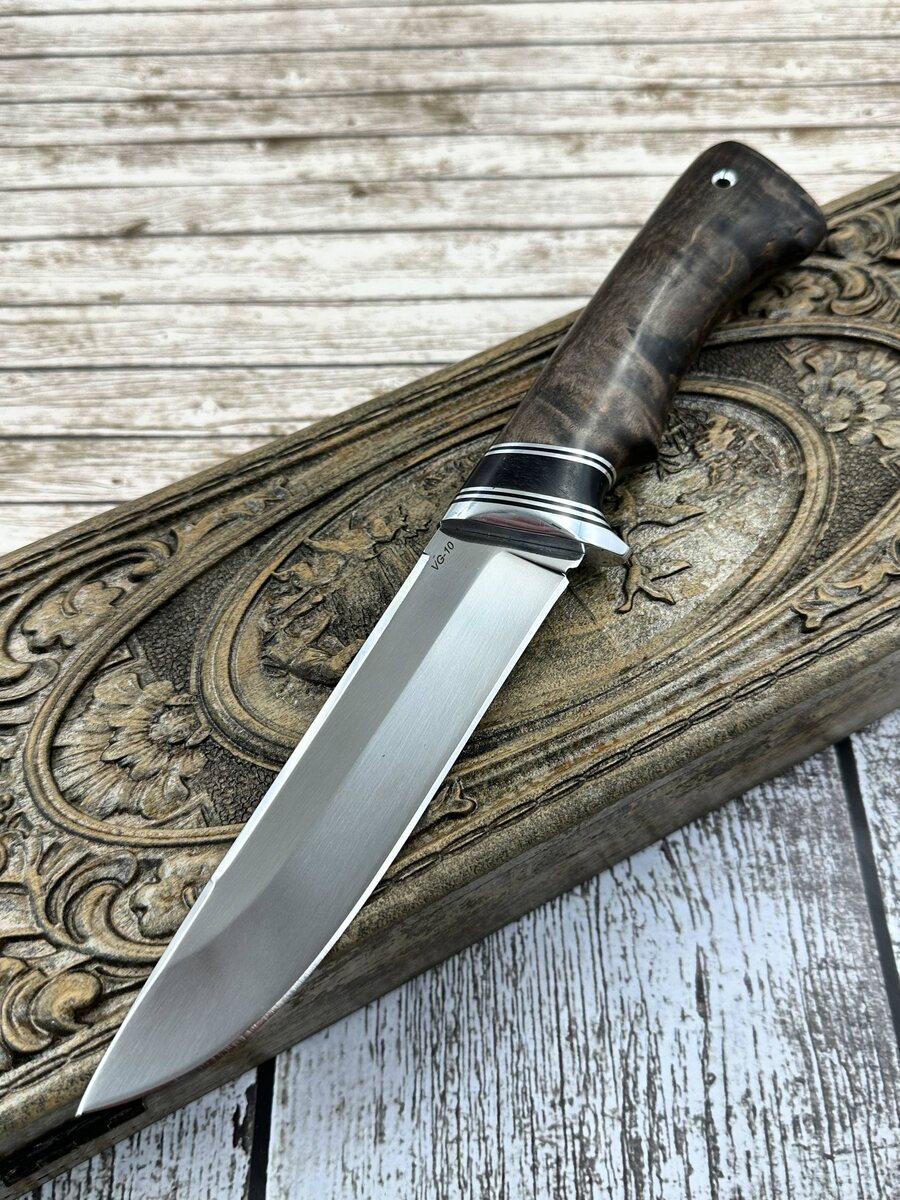 🔪 Универсальный рабочий нож "Вепрь" — надежный помощник для охоты, рыбалки и активного отдыха! Основные преимущества: - Клинок из нержавеющей стали VG-10 с криообработкой — отличная стойкость к коррозии и высокая твердость (HRC 62). Ваш "Вепрь" надолго останется острым и готовым к работе! - Спуски от середины клинка — повышенная прочность даже при боковых нагрузках. - Анатомическая рукоять из стабилизированной карельской березы (коричневая) — не скользит в руке, удобно лежит даже во влажных условиях. - Острота, как у бритвы — резать продукты, разделывать дичь или работать по дереву теперь — одно удовольствие. - В комплекте — ножны из натуральной кожи. Практичный выбор для охотников, рыбаков, туристов и всех, кто ценит надежный инструмент ручной работы. Цена: 9 840 руб. 🔻 Заказывайте прямо сейчас: Telegram: [@Nazarklinokbot](https://t.me/Nazarklinokbot) WhatsApp/Viber: +7 910 134-38-31 🌲 Ремесло в третьем поколении. Пожизненная гарантия на отсутствие производственных дефектов. #н