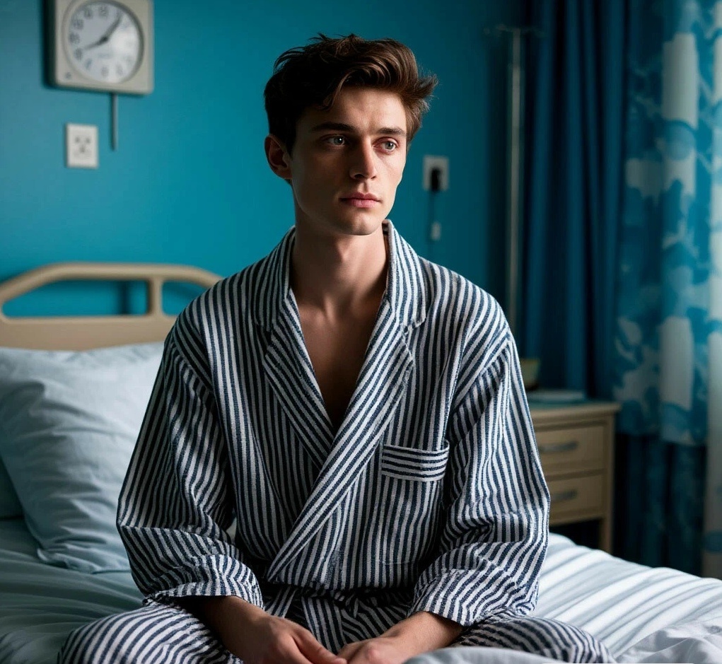 -Мне сказали, что не скоро вас выпишут, - не выдержала, хихикнула, когда увидела в чем тот одет.