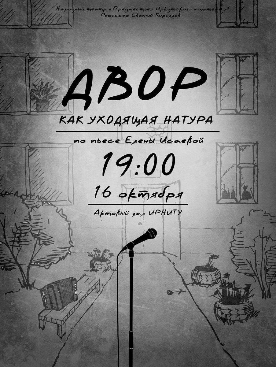 Показ спектакля по пьесе Елены Исаевой «Двор как уходящая натура» 🎭 Название пьесы говорит само за себя. Эта история — о светлом, радостном, тёплом и совсем немного грустном, но уже давно ушедшем времени. История о той эпохе, в которой слово «сосед» имело другое значение. О том времени, когда люди разделяли «радости» и «печали» на всех: любили и ненавидели, смеялись и плакали, грустили и веселились — все вместе. Эта история об ушедшем «счастье». А вот для вас «счастье» — какое оно? Вспомните, когда вы чувствовали самое-самое «счастье»? Спектакль по пьесе Елены Исаевой «Двор как уходящая натура» погружает зрителя в мир, где уютный двор становится символом утраченного времени и потерянных возможностей. Режиссёр — руководитель театра Евгений Кириллов. 📅 Дата: 16 октября 🕒 Время: 19:00 📍 Место: Актовый зал ИРНИТУ Вход по электронной афише.