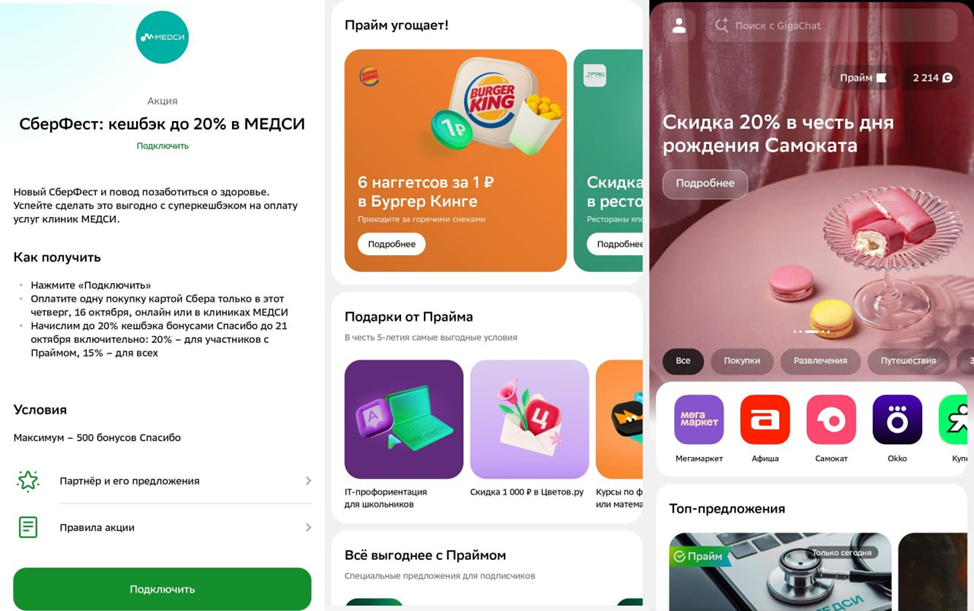 Кешбэк 15% (20% с подпиской Прайм) на услуги в клинике Медси, максимум 500 бонусов Также в честь дня рождения Прайм можно найти спец.предложения: В честь дня рождения Самоката дают скидку 20%. Все предложения сначала нужно найти и активировать.