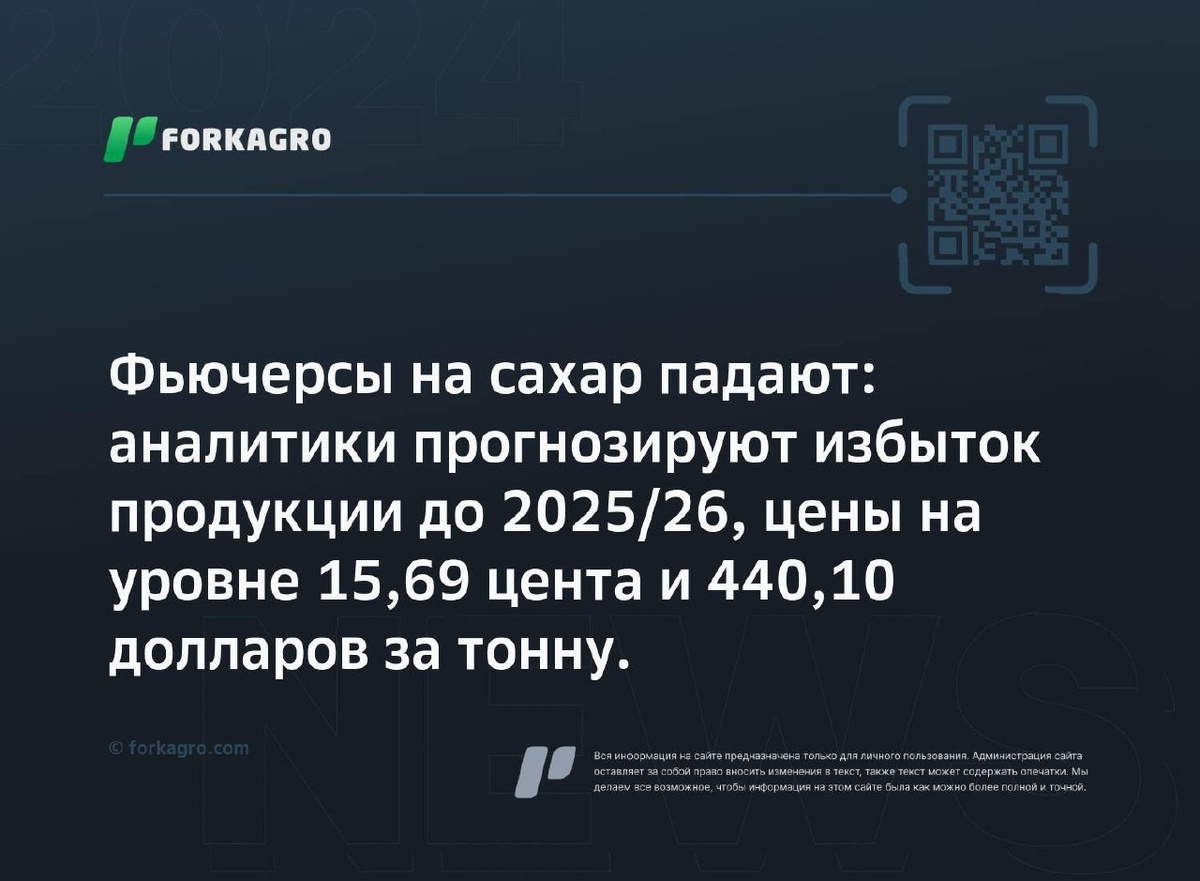 Фьючерсы на сахар падают: аналитики прогнозируют избыток продукции до 2025/26, цены на уровне 15,69 цента и 440,10 долларов за тонну