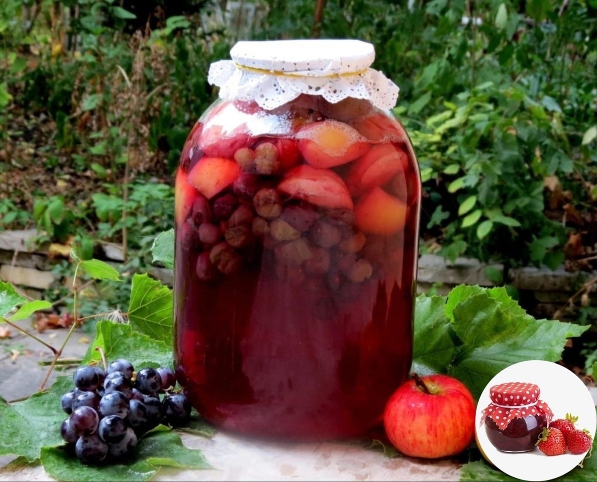 Ингредиенты: Виноград — 200 гр Яблоки — 2-3 шт. Вода — 0,7 литра Сахар — 80 гр Лимонный сок — 1 ст. ложка Приготовление: 1. Отделим ягоды винограда от кистей, промоем их в воде. Пересыпаем их в кастрюлю. Следом промоем яблоки, разрезая и очищая их от семян. Нарежем ломтиками в кастрюлю. Вливаем теплую воду, добавляем сахар и лимонный сок. Сок можно заменить двумя щепотками лимонной кислоты, но обязательно пробуйте компот на вкус, чтобы при необходимости его откорректировать. 2. Поместим кастрюлю на плиту и отварим компот в течение 15-20 минут до мягкости яблочной нарезки. 3. Ошпариваем банку и крышку кипятком, вливаем в нее кипящий компот. Накроем крышкой и сразу же закрутим крышку ключом для консервации. Даем заготовке остыть и после перенесем ее в место хранения: кладовую, подвал, погреб.