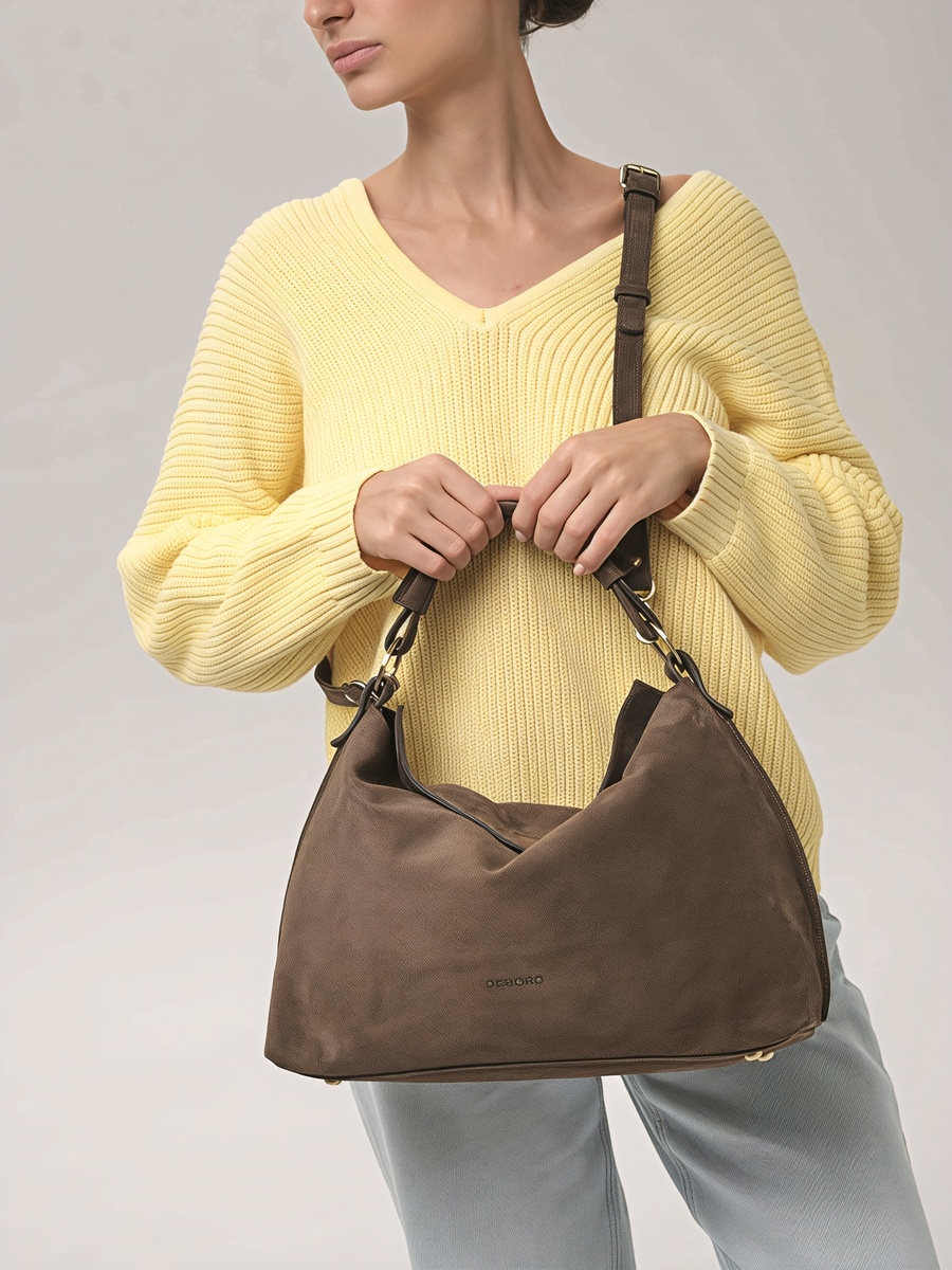 Для повседневных образов — замшевая хобо в карамельном или бежевом. Мягкая, удобная, подходит к трикотажу и джинсам.
