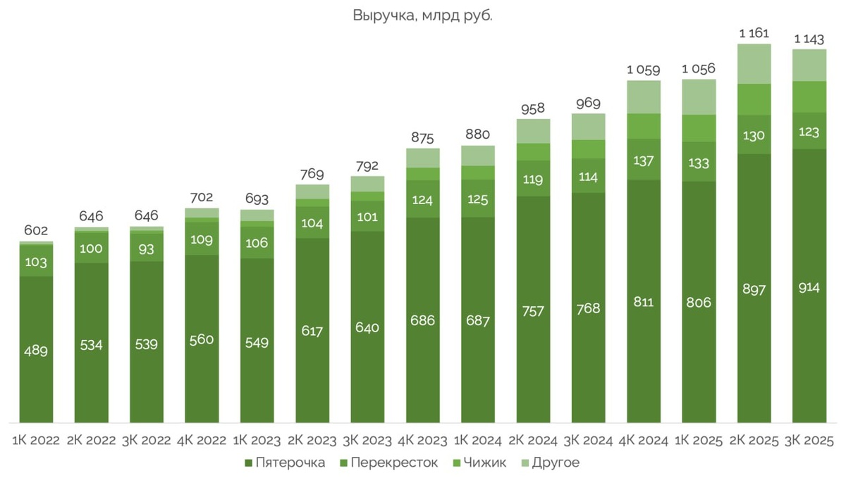 🍏 X5 в III кв. Выручка растет, но не забываем о рентабельности Еще раз обратим внимание на отчет (кое-кто из наших аналитиков стал снова приглядываться к этой бумаге). В III кв. был неплохой рост показателей — сейчас о них кратко и о том, что должно смущать в этом инвестиционном кейсе. Короче говоря, коротко о том, что нужно знать каждому, у кого есть или планируют купить акции X5. Что радует (ТОП-3 факта роста): Чистая розничная выручка подросла до 1,14 трлн руб. (+18% г/г). Небольшое замедление роста относительно I и II кв. связано со снижением продовольственной инфляции. Из драйверов: увеличение LFL-продаж на 10,6% и расширение торговых площадей на 11,4%. Чижик — потенциальный локомотив. Рост формата составил +65,3% (до 103,8 млрд руб.) — почти 9% всей выручки группы. Цифра рулит. X5 Digital (Vprok.ru, доставка) подскочил на 43,6% (65 млрд руб.). Компания адаптируется под современные тенденции и зарабатывает на этом. Что тревожит: — Маржа под давлением. Компания снизила прог