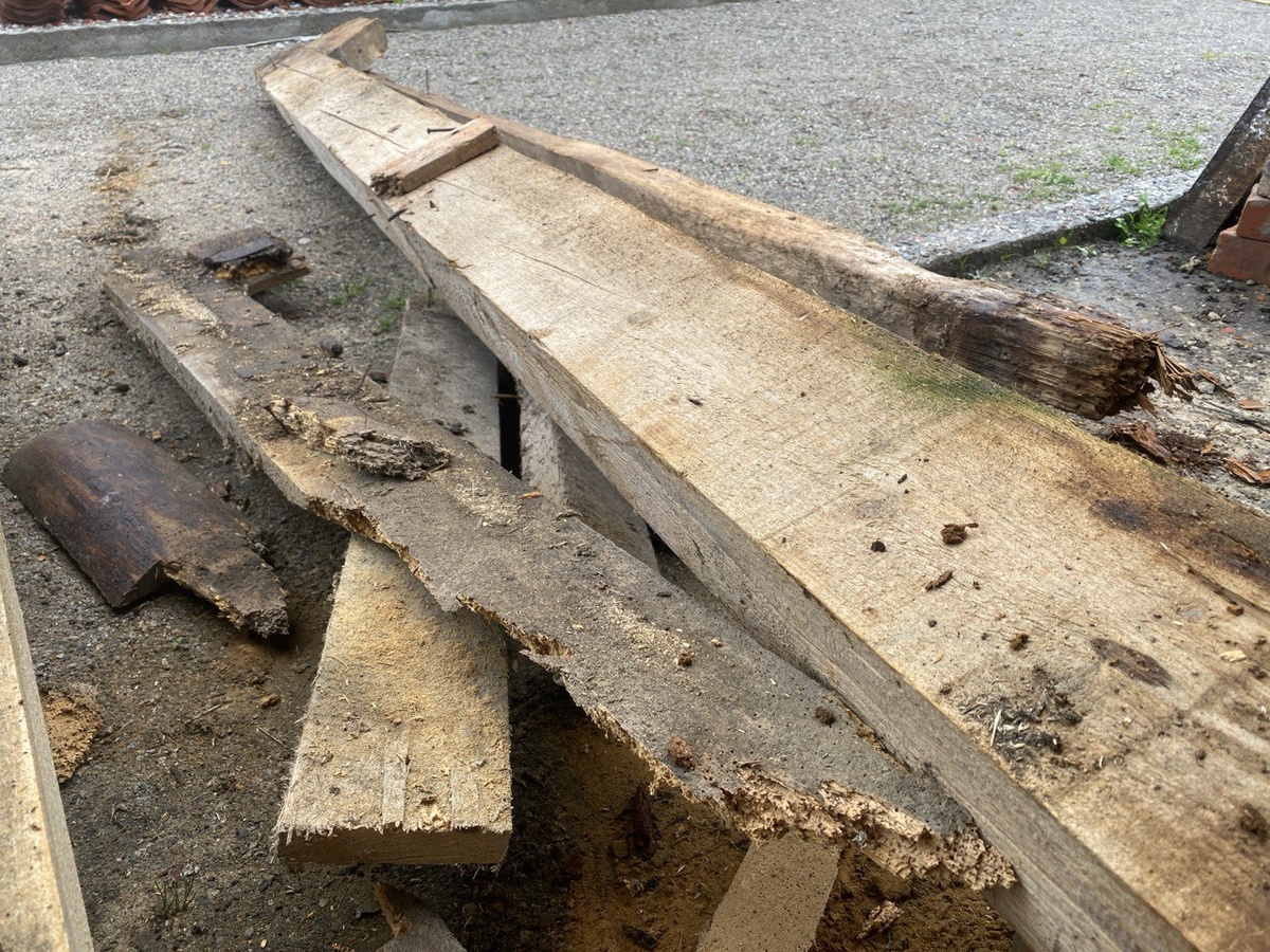 Первым делом мы занялись балками. Старые, местами подгнившие, где-то даже просто труха. Решили не откладывать и обрезали всё, что вызывало хоть малейшие сомнения. Скажу честно — местами приходилось отрезать больше, чем хотелось, зато теперь точно знаем, что основа будет крепкая и надёжная.