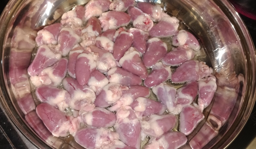 Жаренные куриные сердечки и желудки давно стали любимым блюдом многих людей. Предлагаю рецепт, который отлично подойдет к повседневному обеду или ужину. Ингредиенты: Куриные сердечки – 500 грамм Куриные желудки – 500 грамм Лук репчатый – 2 шт. среднего размера Чеснок – 3 зубчика Томатная паста – 1 столовая ложка Соль - по вкусу Перец черный молотый – по вкусу Масло растительное – 3 столовые ложки. Приготовление: Сердечки и желудки предварительно промойте холодной водой, удалите лишний жир и пленки. Желудки рекомендуется предварительно отварить минут 30. Лук очищаем и нарезаем полукольцами. Чеснок так же очищаем и мелко измельчаем. Разогреваем сковороду с маслом на среднем огне, добавляем сердечки и готовим минут 20 периодически перемешивая. Затем добавляем отварные желудки и лук, готовим минут 15 периодически помешивая. По истечению времени добавляем соль, перец, томатную пасту, чеснок и постоянно перемешиваем, не отходя от сковороды, две минуты (томат не должен подгорать, иначе блю