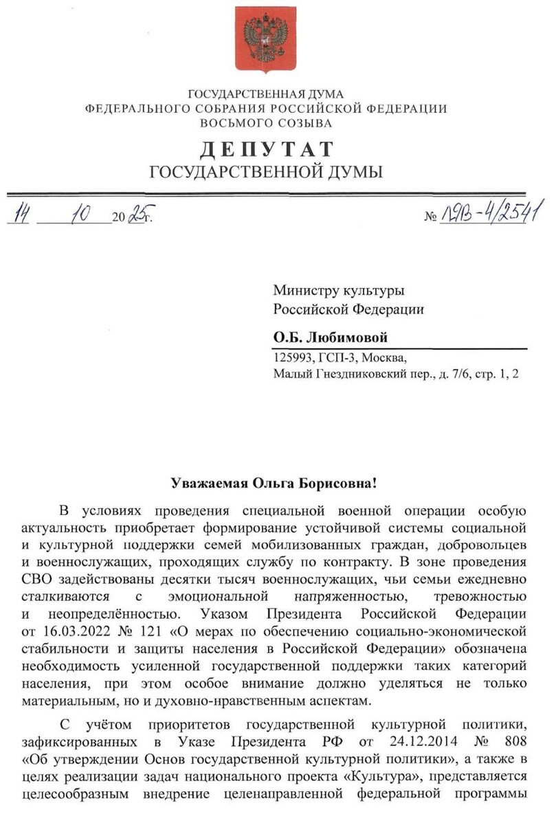🇷🇺Предложила внедрить госпрограмму культурной поддержки семей участников СВО