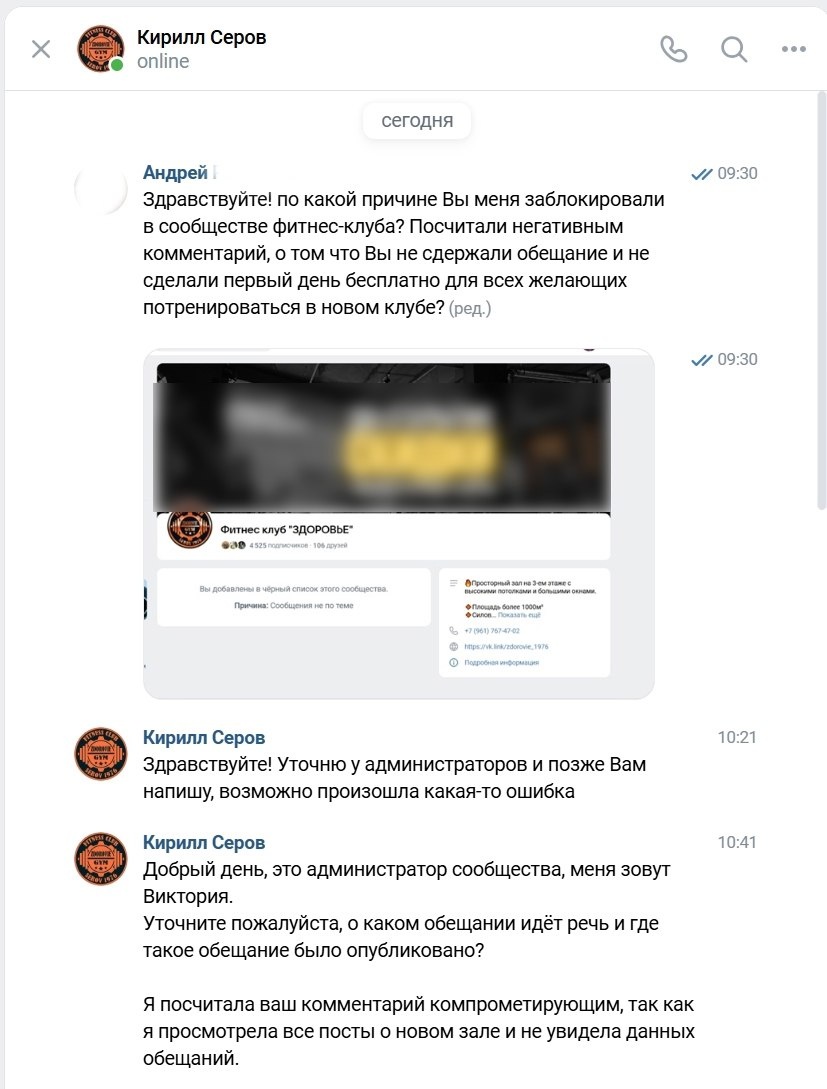 Ситуация простая, я как пользователь соцсети и клиент фитнес-клуба оставил комментарий над их постом, о том, что круто было сделать "День открытых дверей". И мне даже ответили в шутливой форме от имени сообщества. Но, потом видимо пришла другая злая тетя-редактор с гостями из Краснодара и удалила ветку комментариев, а меня как главного злодея закинули блокировку. Видите ли, я дискредитирую деятельность их клуба.