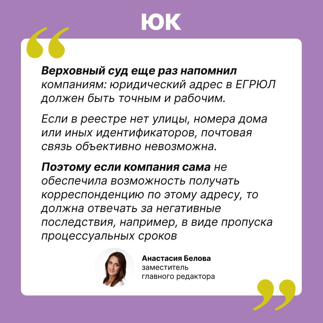Неполный адрес в ЕГРЮЛ — риск самой компании ➡️ Верховный суд поддержал нижестоящие суды, которые отказались восстановить компании срок на подачу апелляционной жалобы. Первая инстанция рассмотрела спор без ее участия и удовлетворила требование истца. Компания утверждала, что не была извещена о процессе, так как почта не предпринимала попыток доставить корреспонденцию. ✨ Однако суды выяснили: в ЕГРЮЛ указан неполный адрес — без улицы и номера дома, при том что в населенном пункте не менее 25 улиц. Это исключало возможность доставки. Кроме того, письма, направленные на адрес гендиректора, вернулись с отметкой «истек срок хранения». ВС согласился: компания сама не обеспечила возможность получения корреспонденции по своему юрадресу, и потому должна нести риск неблагоприятных последствий в результате неполучения судебных актов (Определение ВС от 03.10.2025 по делу № А41-42976/2023). ↖️ О других важных позициях Верховного суда читайте в статье журнала «Юрист компании». Подписчикам кана