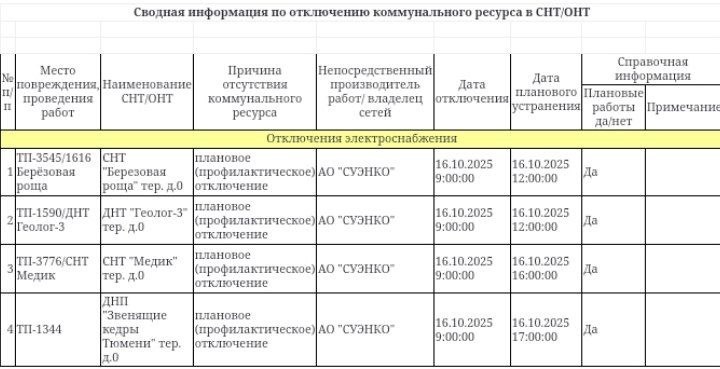Информация по плановым отключениям в СНТ/ДНТ на 16.10.2025 от ЕДДС города Тюмени