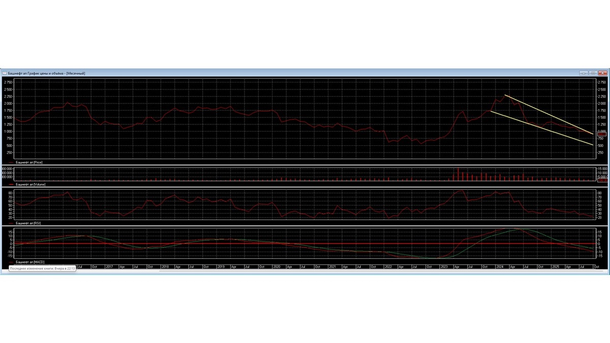 Месячный график показывает, что акция Башнефть (п) подтверждает движение, которое происходит по линии сопротивления понижающего коридора. Быки и медведи не делают попытку выхода из коридора, а медведи не делают попытку развернуться в сторону линии поддержки. Индикатор RSI сверху практически дошел до уровня 20%, индикатор MACD располагается под нулевым уровнем и двигается вниз. Объем торгов имеет тенденцию плавного понижения активности инвесторов в акции.