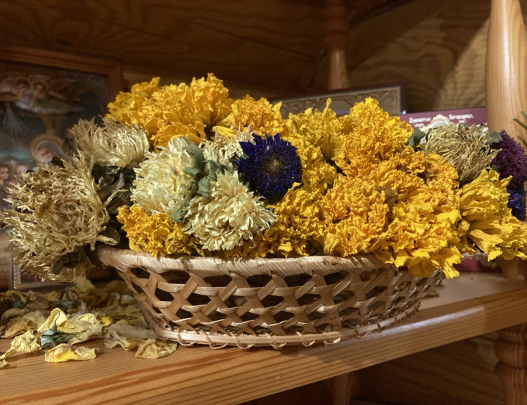 Многовековой опыт предков мудро учит запасать лето впрок. На зиму в дом переезжают овощи: весёлые пузатые тыквы, стройные кабачки, летающие тарелки-инопланетяне патиссоны, дружная морковь и лекарь чеснок. Из банок на полках подмигивают огурцы. Добрые томаты и подружки-вишенки, любовь-клубника, сочная слива довольно улыбаются. Все они живые и настоящие, словно летом. Удобно устроившись на полках, они продолжают быть полезными. Покорно и смиренно они ждут своей очереди, когда же благодарная рука хозяина потянется к ним, чтобы перенести на душевный щедрый стол. Вот тогда-то всё внимание достанется счастливице-баночке. Вот тут-то она от всей души послужит — будет радовать глаз, дарить яркость вкусов и делиться витаминами. Вместе с овощами и ягодами в тёплый деревянный дом переезжают цветущие клумбы. Аккуратно собранные в букеты и тщательно просушенные, ароматные цветы сохраняют свою яркость всю зиму, продолжая нести свою миссию любви и красоты, продлевая её в уютном зимнем доме, согревая д